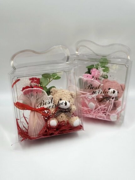 SVARBU: rožių meškiukas yra įdėtas į kvadratinę gražią permatomą dėžutę ir surištas kaspinu, todėl jį galima dovanoti iš karto.