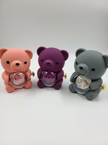Tai ne tik meškutis, tai meškutis kuriame galite įdėti savo dovaną. Šiuo metu meškutyje jau rasite auskarus, tačiau yra galimybė juos išimti ir įdėti savo norimą suvenyrą. Auksinė rankenėlė yra tam, kad viduje esanti rožė suktusi, jei norite galite palikti priekyje arba muilo rožę arba savo suvenyrą. Taip pat papildomai jau gaunate ir dovanų maišelį skirtą meškučiui. Aukštis 13 cm.