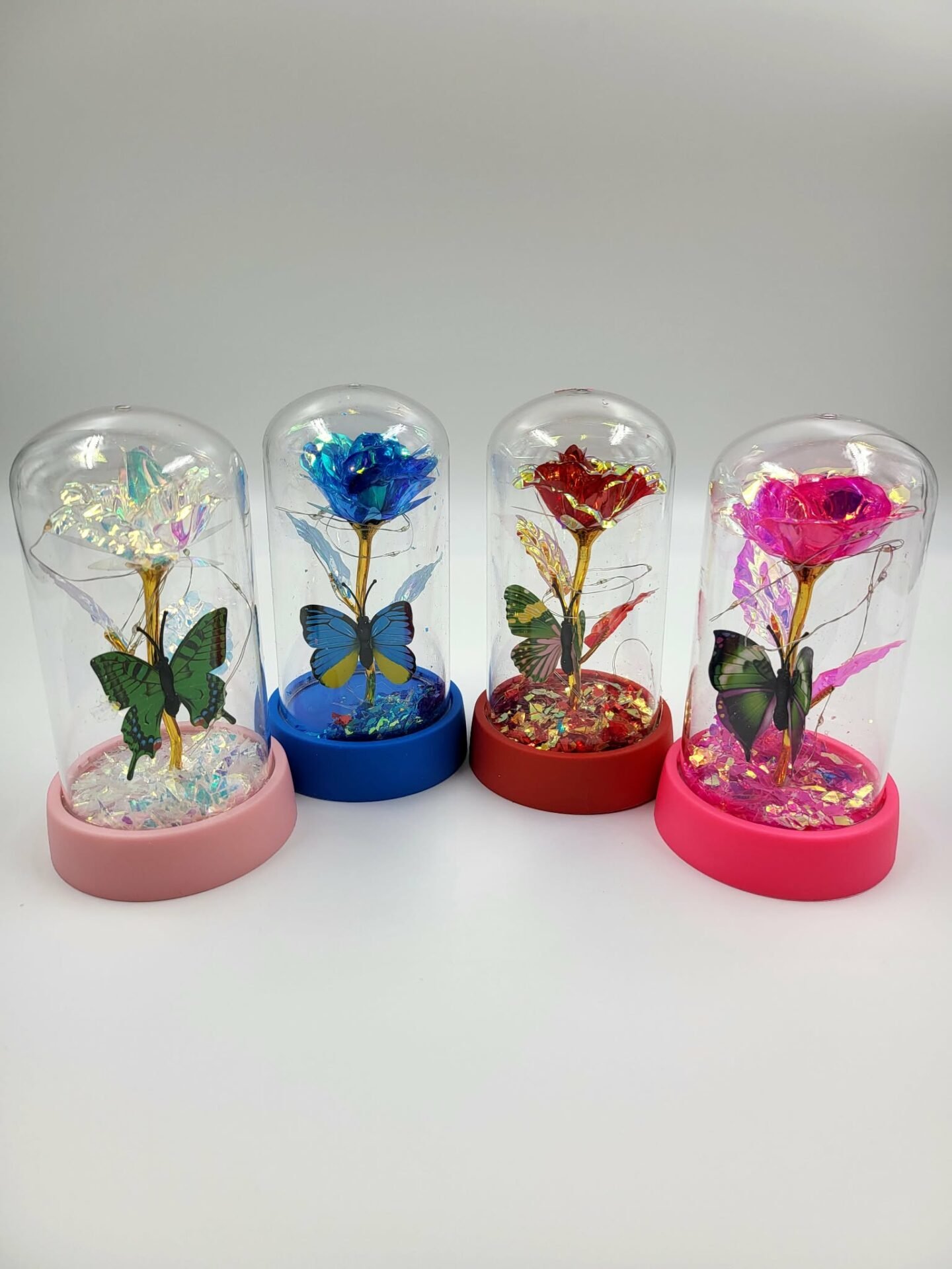 Gaubte yra gelė, kuri yra papuošta blizgučiais, drugeliu ir led lemputėmis.
